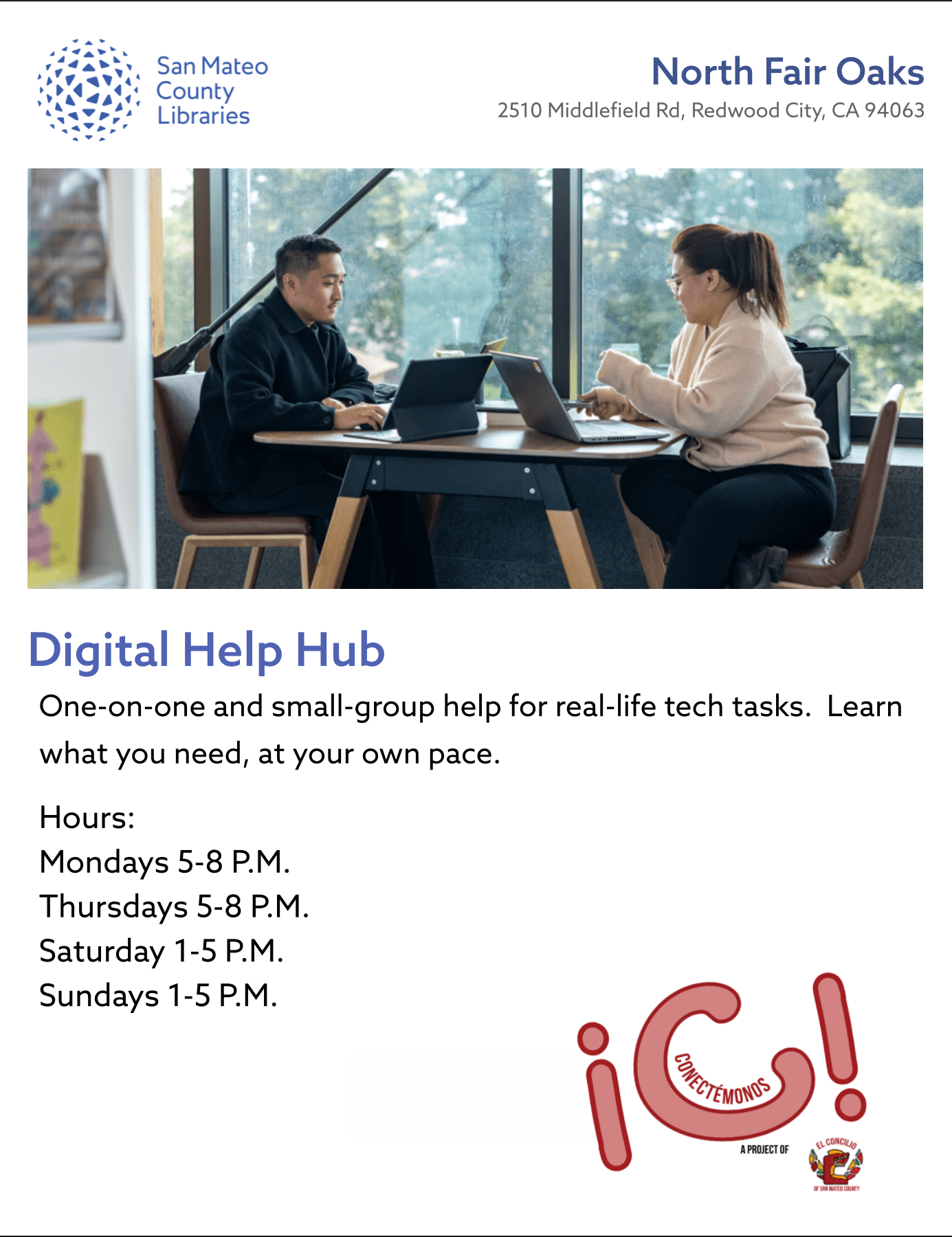Location: North Fair Oaks Library 2510 Middlefield Rd., Redwood City