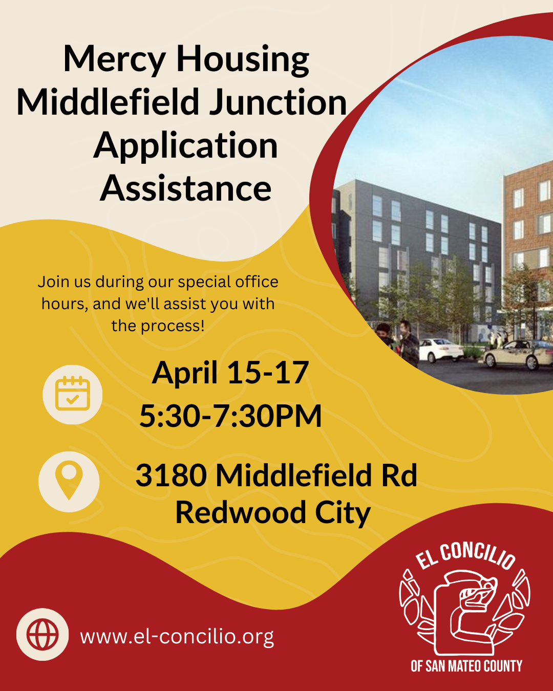 Location: 3180 Middlefield Rd. Redwood CityJoin us during our special office hours, and well assist you with the Mercy Housing Middlefield Junction Housing application.